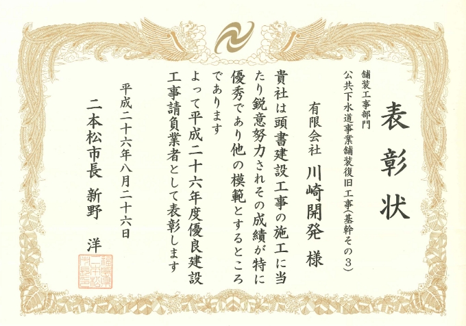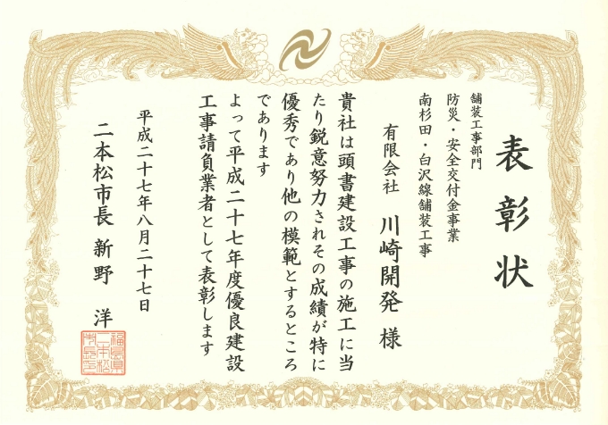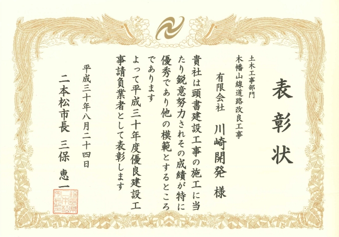 私たち川崎開発は、昭和53年創業以来、二本松市をはじめ、福島県県北地方におきまして、主に土木建設業として、事業を営んでまいりました。 「不易流行」をモットーに、古くからの地域の人々のつながりを大切にし、土木建設会社として与えられた仕事に堅実に取り組みながら、絶えず変化する現代において、多様なニーズに応えられるよう、新しいものにもチャレンジしていきたいと考えております。 今後とも一層のご支援を賜りますよう、よろしくお願い申し上げます。